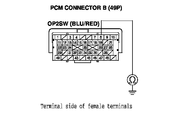 14. Check for continuity between PCM connector terminal B8 and body ground.
