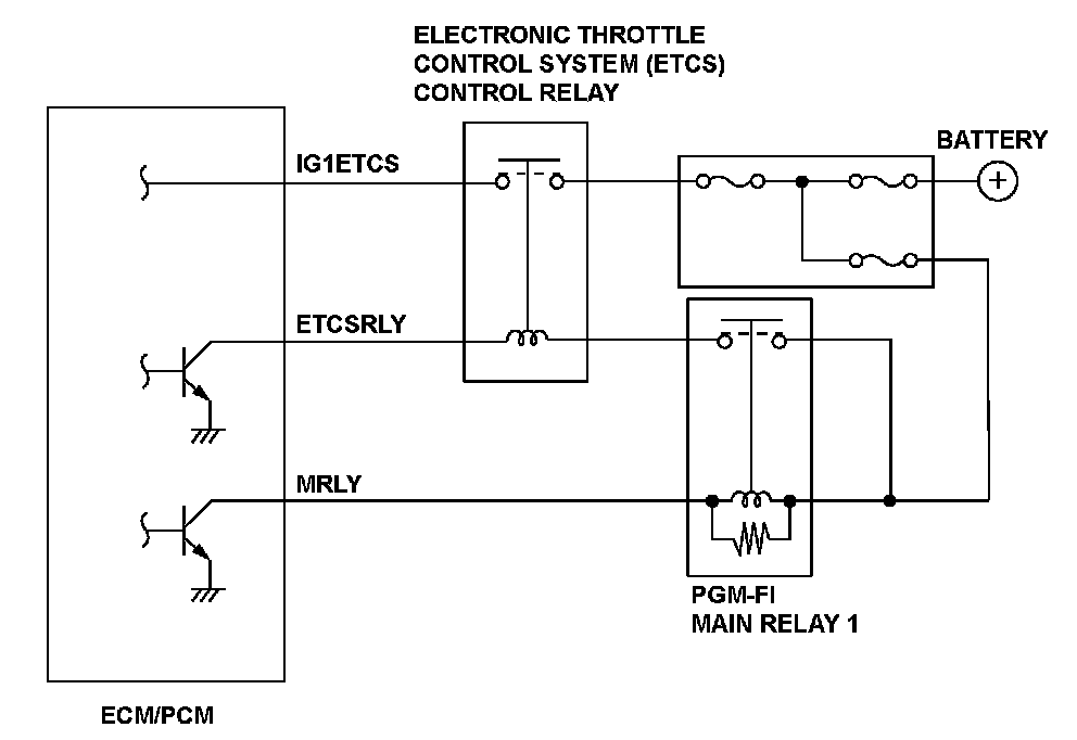 The electronic throttle control system controls the throttle valve opening. The system includes the throttle actuator, the throttle valve, throttle position (TP) sensors A and B, the electronic throttle control system (ETCS) control relay, the accelerator pedal position (APP) sensor, and the engine control module (ECM)/powertrain control module (PCM). When the accelerator pedal is pressed, the APP sensor detects the accelerator opening value. The accelerator pedal opening value is converted to a signal in the APP sensor and transmitted to the ECM/PCM to compute the target position. The ECM/PCM determines the throttle valve target position according to the signal received and operates the throttle actuator to move the throttle valve to the target position. The actual throttle valve position is determined by TP sensors A and B (installed in the throttle body). When the voltage is applied from the ETCS control relay to the IG1ETCS terminal for a set time after the ETCS control relay is turned off, the ECM/PCM detects a malfunction in the ETCS control relay power switch and stores a DTC.