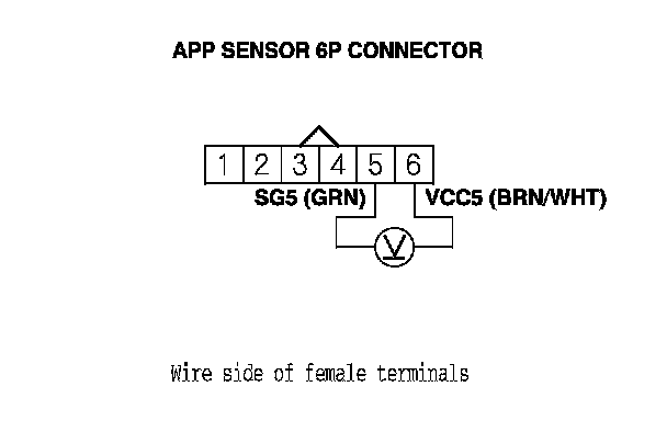 6. Measure the voltage between APP sensor 6P connector terminals No. 5 and No. 6.