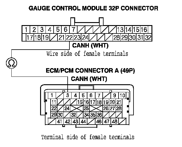 10. Check for continuity between ECM/PCM connector terminal A3 and gauge control module 32P connector terminal No. 22.