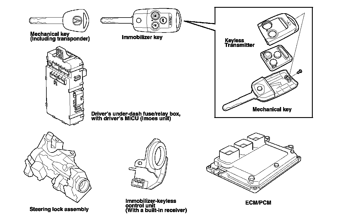 This system consists of a transponder built into the ignition key, an immobilizer-keyless control unit (with a built-in receiver), the driver's MICU (has built-in IMOES unit), an immobilizer indicator, and the ECM/PCM.