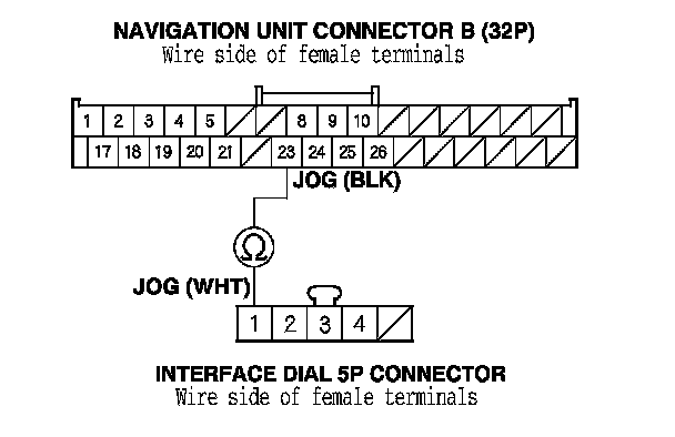10. Check for continuity between navigation unit connector B (32P) terminal No. 23 and interface dial 5P connector terminal No. 1.