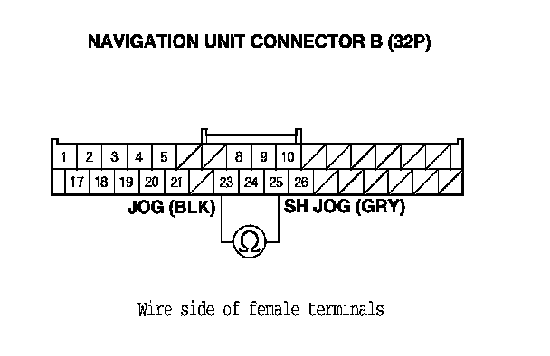 11. Check for continuity between navigation unit connector B (32P) terminals No. 23 and No. 25.