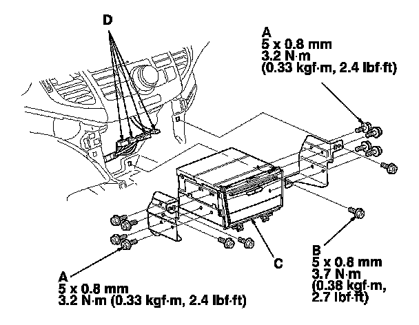 6. Disconnect the connectors (D), then remove the audio unit.