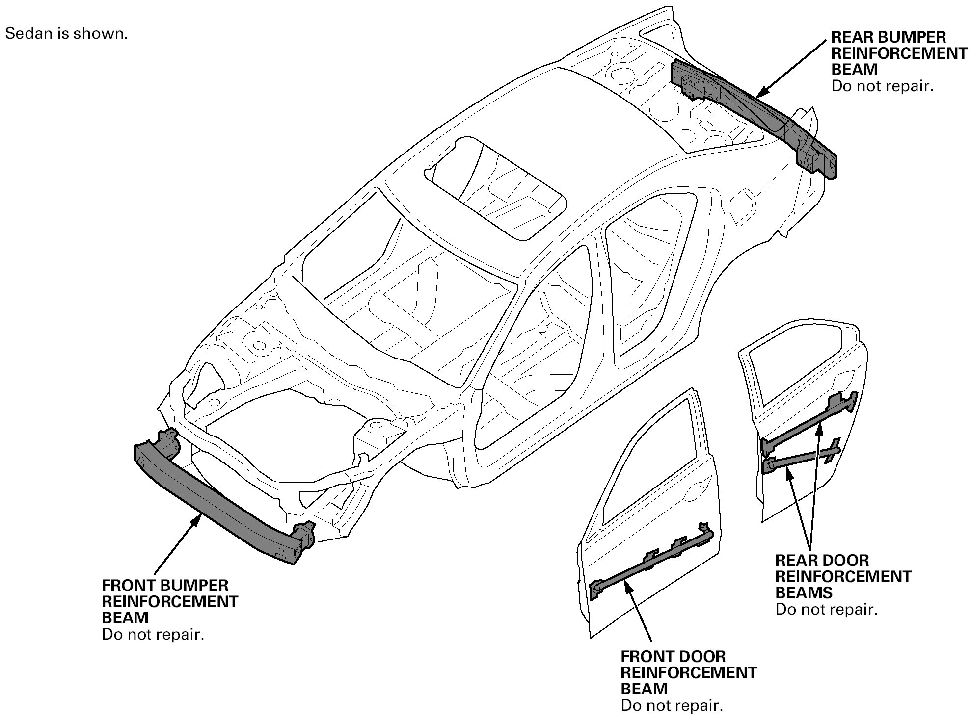 For this reason, the door and bumper reinforcement beams should NEVER be repaired; they must be replaced if they are damaged.
