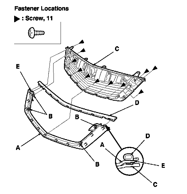 2. Remove the screws. Pull out the front grille lower molding (A) to release the hooks (B) from the front grille base (C), then remove the molding.