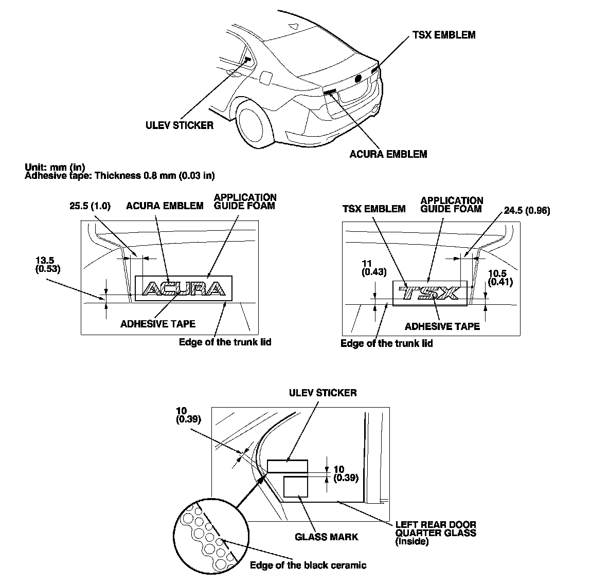 - ACURA and TSX emblems: Remove the adhesive backing. Put the emblem with the application guide foam on the trunk lid as shown, then press the emblem into place, then remove the film and the application guide foam.