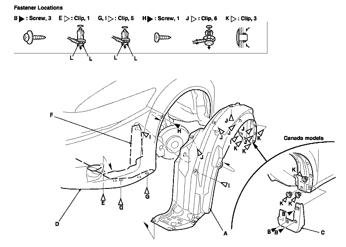From the wheel arch, detach the clips (I, J, K) that secure the front inner fender (and splash shield) to the body.