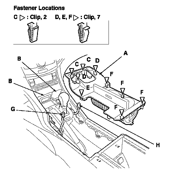 -3 Hook the edge of the panel beside the parking brake lever up with the appropriate trim tool to detach the clip (E).