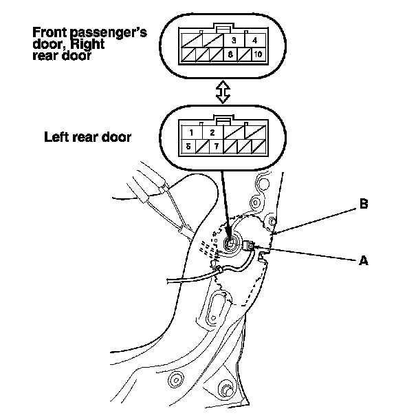 2. Disconnect the 10P connector (A) from the door lock actuator (B).