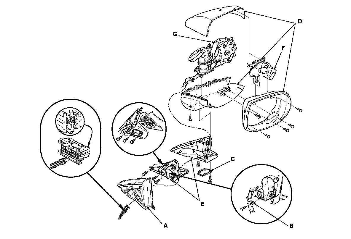 11. Remove the screws and disassemble the mirror housing, then remove the mirror actuator (G).