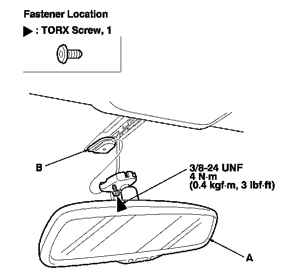 3. Loosen the screw with a TORX T20 bit, then slide the rearview mirror (A) rearward and off the mount (B).