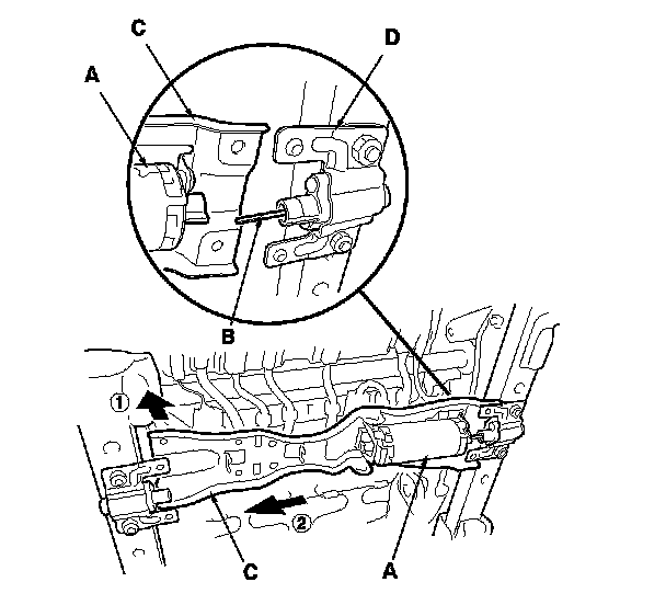 Disconnect the cable from the worm gear (D) in the inner seat track by pulling out the housing.