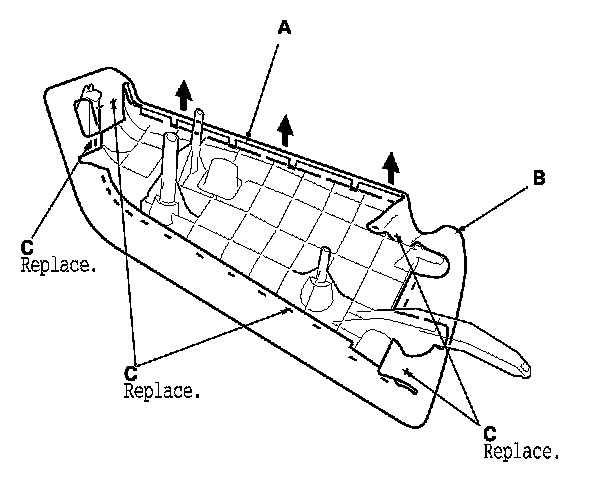 2. Release all the hook strips (A), fold back the seat side bolster cover (B), and release all the staples (C) fastening the cover.