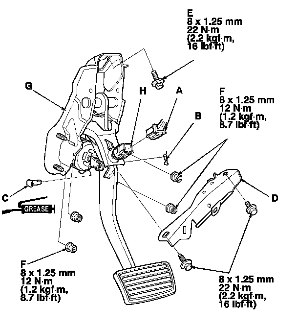 5. Remove the brake pedal bracket mounting bolt (E) and nuts (F).