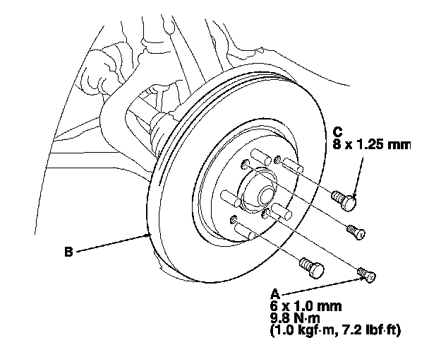 NOTE: If the brake disc is stuck to the front hub, thread two 8 x 1.25 mm bolts (C) into the brake disc to push it away from the front hub. Turn each bolt 90 degrees at a time to prevent the brake disc from binding.