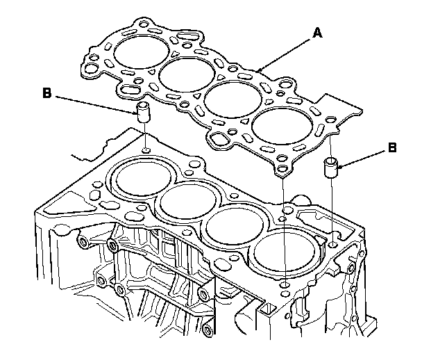 3. Install the new cylinder head gasket (A) and the dowel pins (B) on the engine block. Always use a new cylinder head gasket.