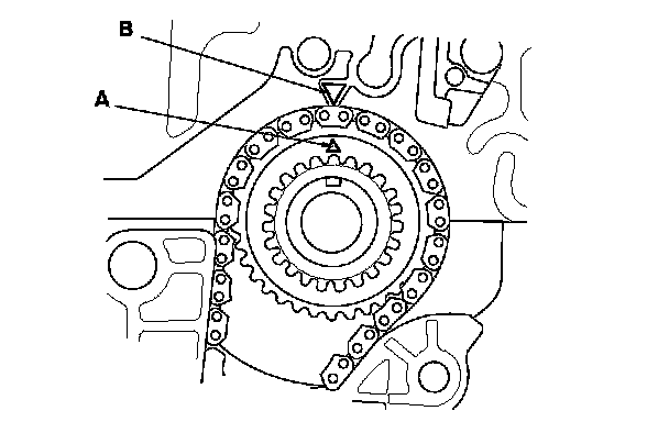 4. Set the crankshaft to top dead center (TDC). Align the TDC mark (A) on the crankshaft sprocket with the pointer (B) on the engine block.