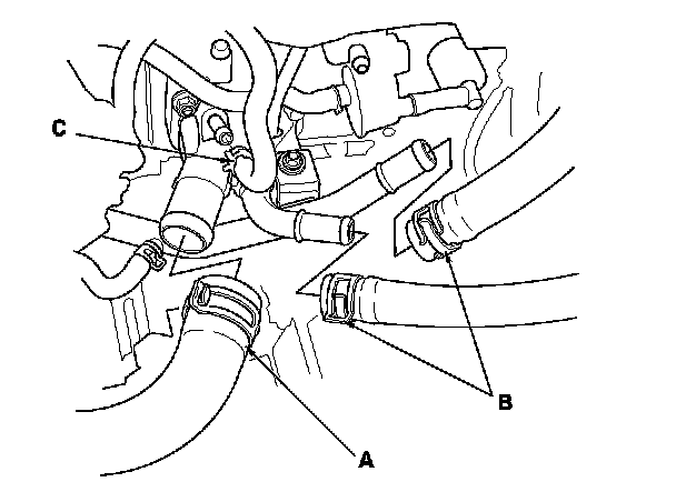 16. Connect the upper radiator hose (A), the heater hoses (B), and the water bypass hose (C).