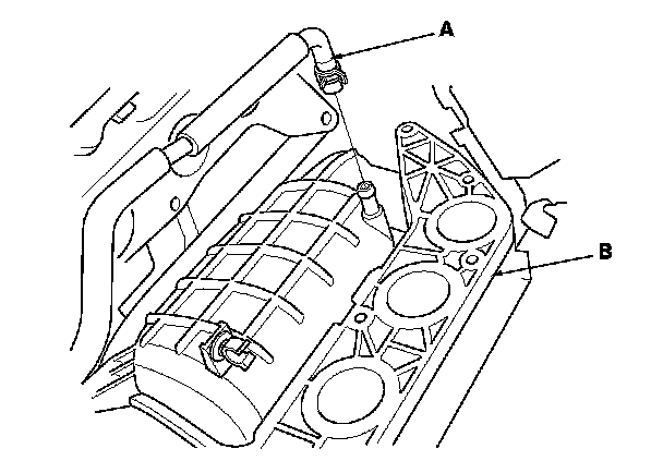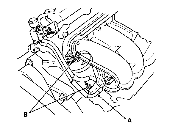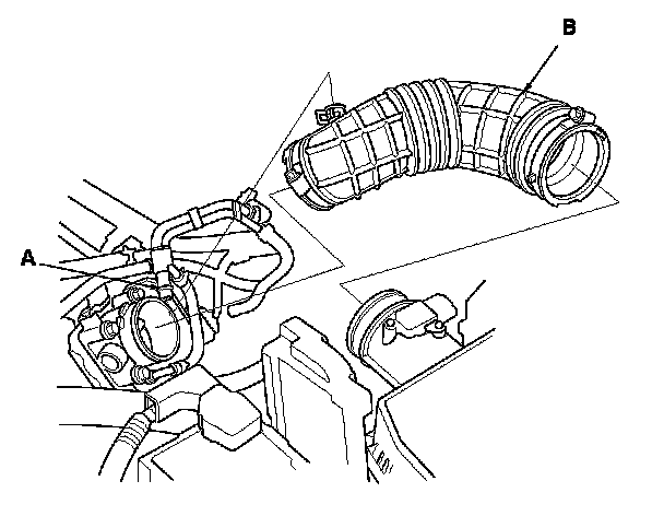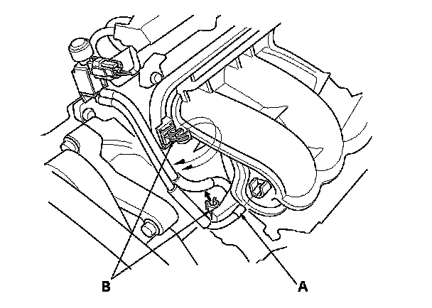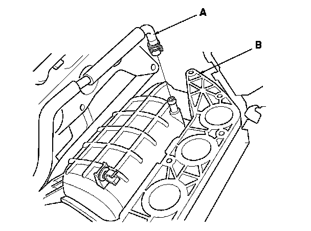 3. Disconnect the evaporative emission (EVAP) canister hose (A) and the brake booster vacuum hose (B).