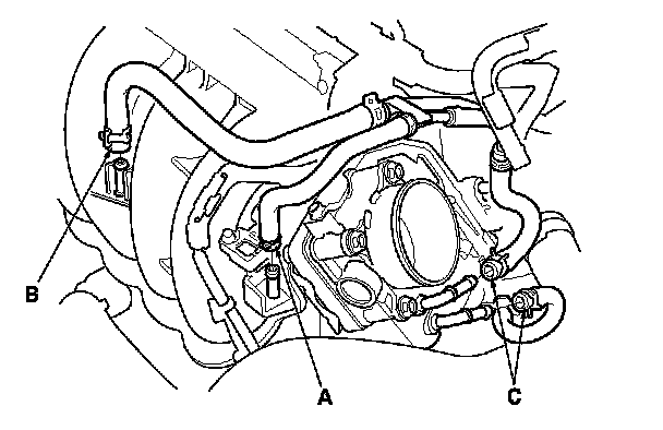 8. Connect the EVAP canister hose (B) and the brake booster vacuum hose (C).