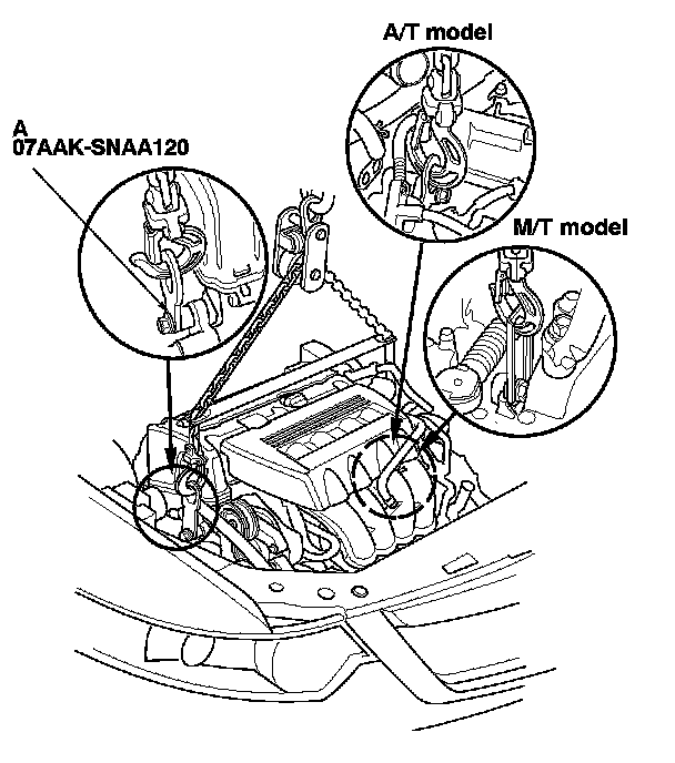 2. Raise the vehicle on the lift, and position the engine/transmission under the vehicle. Lower the vehicle, and attach the universal lifting eyelet (A) and the chain hoist to the engine, then lift the engine into position in the vehicle.