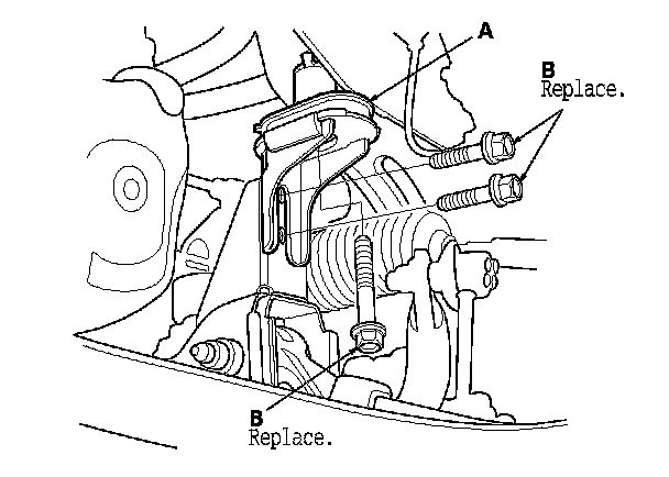 14. Install the subframe middle mount (A), then loosely tighten the new subframe middle mount mounting bolts (B).
