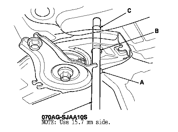 16. Insert the subframe alignment pin (070AG-SJAA10S) through the positioning slot (A) on the right rear stiffener, through the positioning hole (B) on the subframe, and into the positioning hole (C) on the body, then loosely tighten the subframe right rear mounting bolt.
