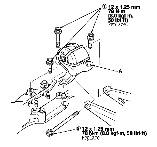 31. M/T model: Install the rear engine mount (A), then tighten the new rear engine mount mounting bolts in the numbered sequence shown.