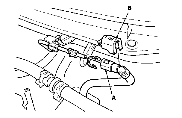 59. Install the evaporative emission (EVAP) canister hose (A) and the brake booster vacuum hose (B).
