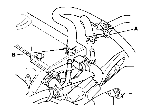 48. Connect the upper radiator hose (A) and the heater hoses (B).