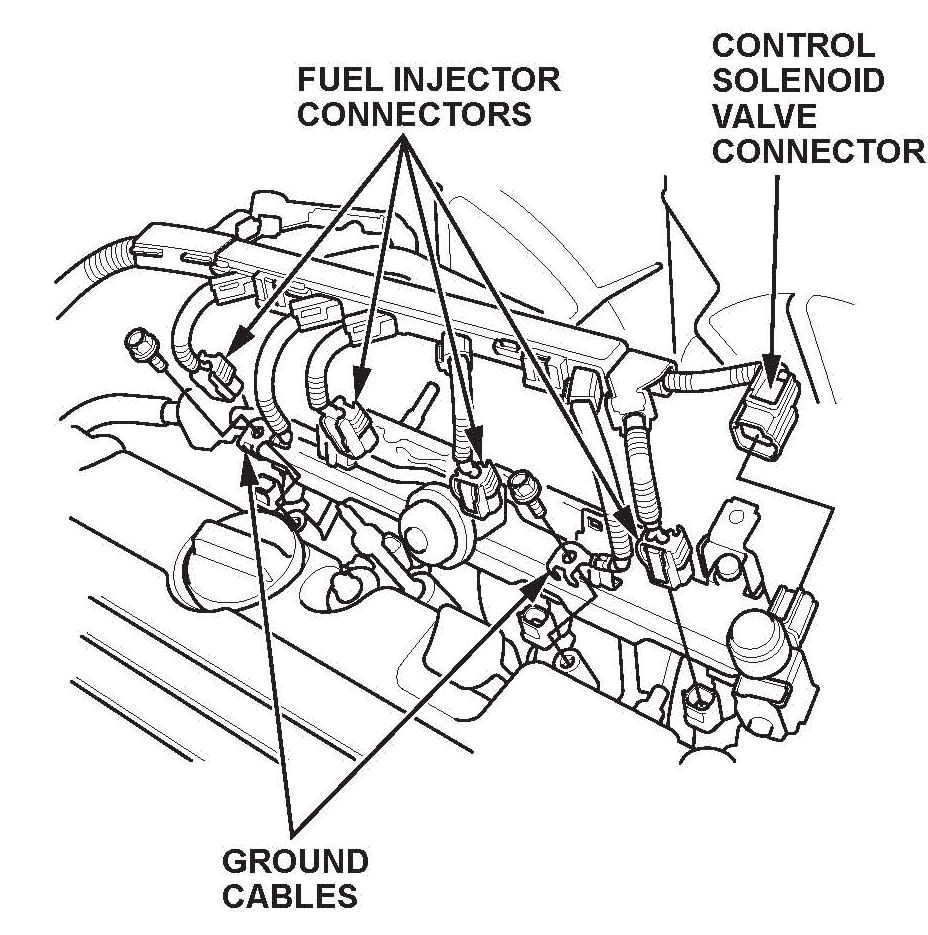 91. Reconnect the four fuel injectors, the engine mount control solenoid connector, and the ground cables.