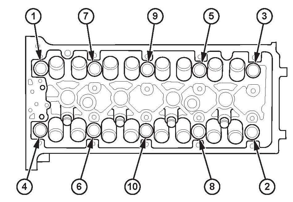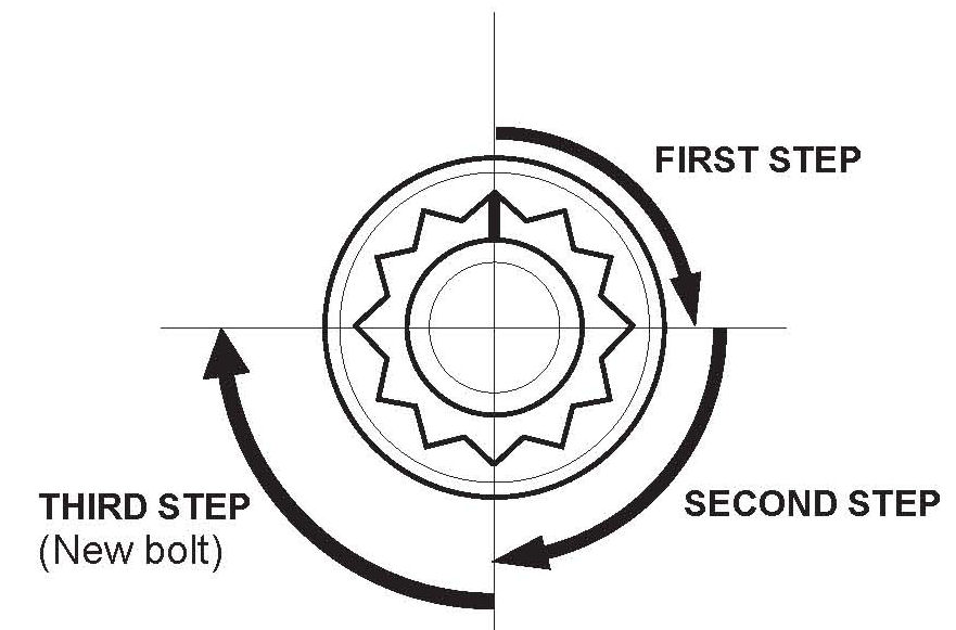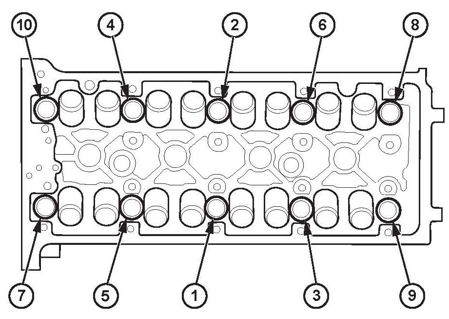 ^ After torquing, tighten all cylinder head bolts in two steps (900 per step) using the sequence shown above. If you are using a new cylinder head bolt, tighten the bolt an extra 90°.