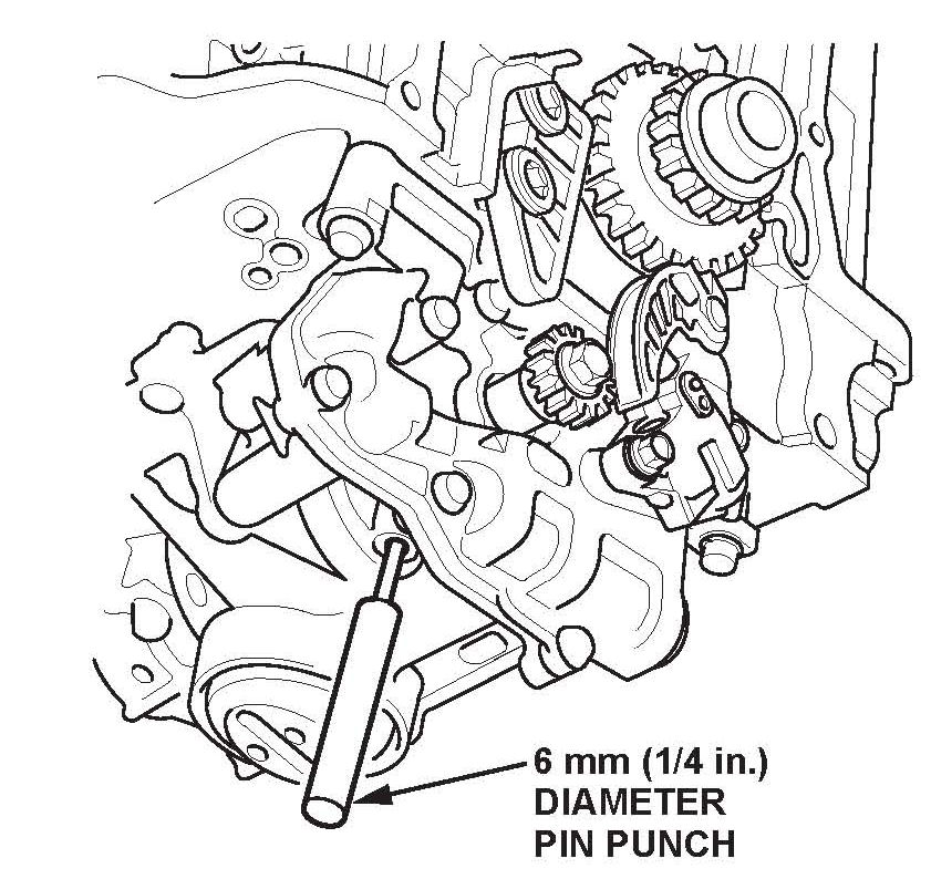 66. To hold the rear balancer shaft, insert the 6 mm (1/4 in.) diameter long pin punch into the maintenance hole in the balancer shaft holder and through the rear balancer shaft.