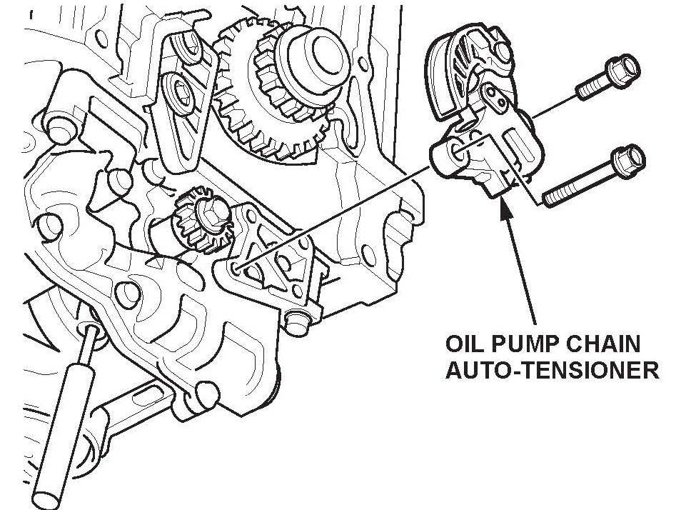 ^ Apply new engine oil to the threads of the oil pump sprocket mounting bolt, then install it and torque it to 44 N.m (33 lb-ft).