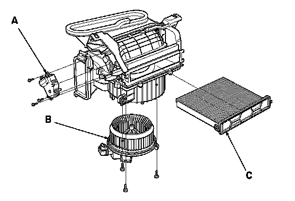 - The recirculation control motor (A), the blower motor (B), and the dust and pollen filter (C) can be replaced without removing the blower unit.