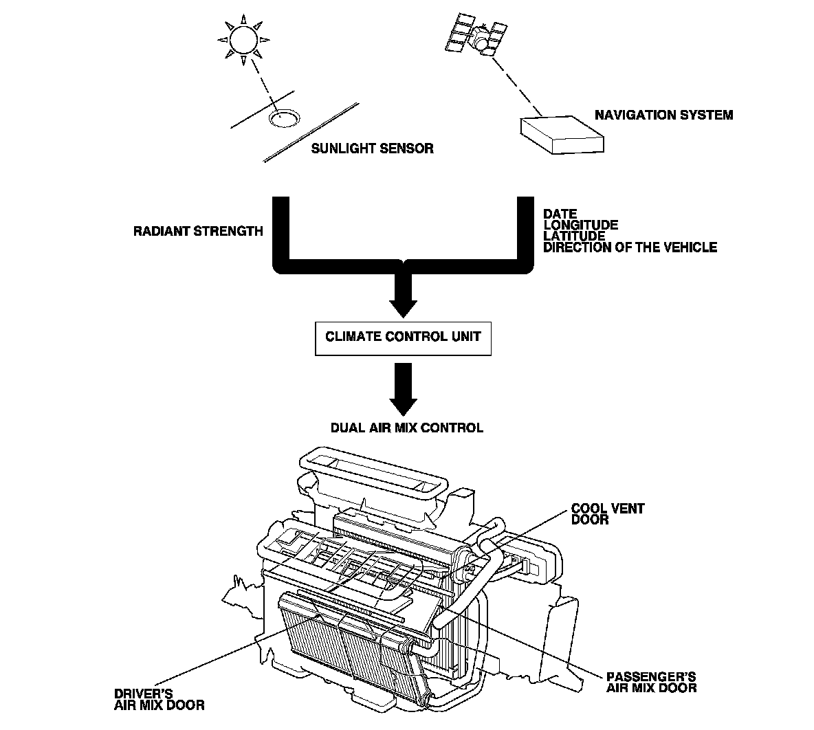 This system automatically controls the temperature and the vent mode of the air direction to the driver and passenger's side depending on the angle of the sun and the direction of the vehicle. It calculates information such as date, time, longitude, and latitude from the navigation system, as well as the radiant strength of the sun from the sunlight sensor, to determine the appropriate mode position and temperature to be directed to each side.