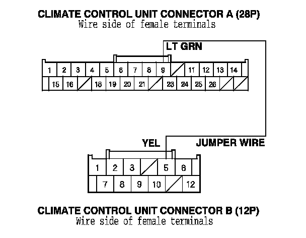 6. Connect climate control unit connector A (28P) terminal No. 9 and climate control unit connector B (12P) terminal No. 5 with a jumper wire.