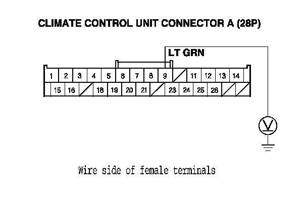 4. Measure the voltage between the climate control unit connector A (28P) terminal No. 9 and body ground.
