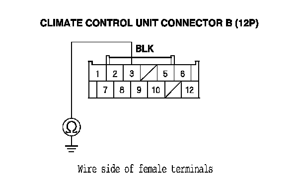 7. Check for continuity between the climate control unit connector B (12P) terminal No. 3 and body ground.