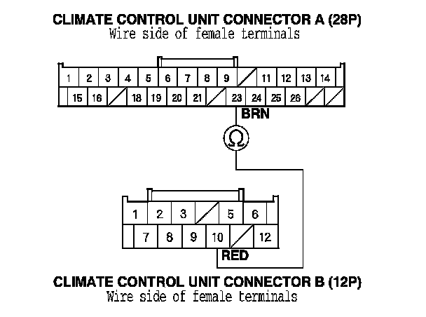 17. Measure the evaporator temperature sensor resistance between the climate control unit connector A (28P) terminal No. 23 and connector B (12P) terminal No. 10.