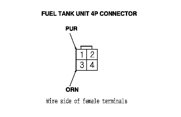 7. Measure the voltage between fuel tank unit 4P connector terminals No. 1 and No. 3 with the ignition switch turned to ON (II). There should be battery voltage.