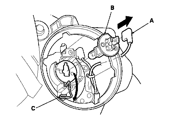 4. Pull the retaining spring (C) away from the bulb then remove the bulb.