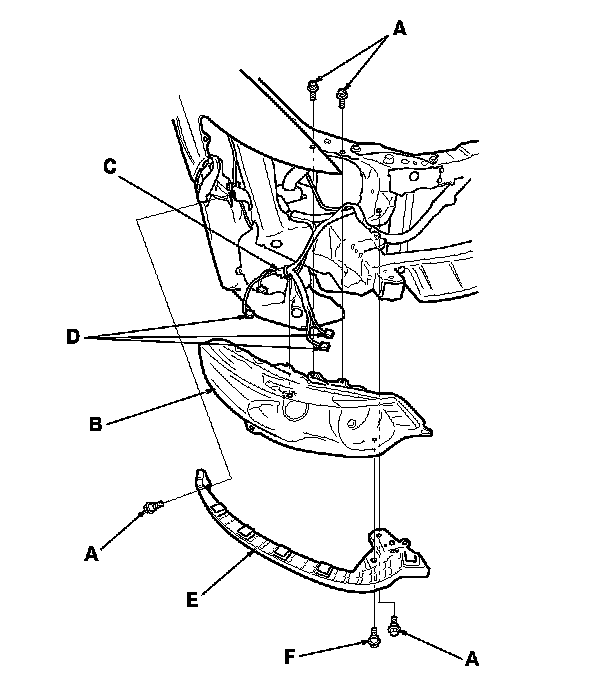 5. Remove the bolt (F) and the corner upper beam from the headlight.