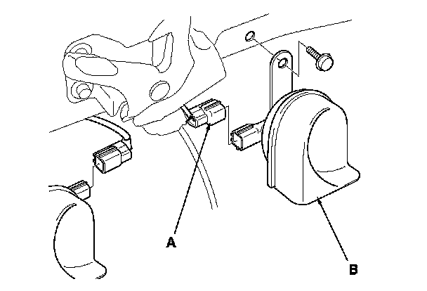 3. Test the horn by momentarily connecting battery power to the terminal (A) and grounding the bracket (B). The horn should sound.