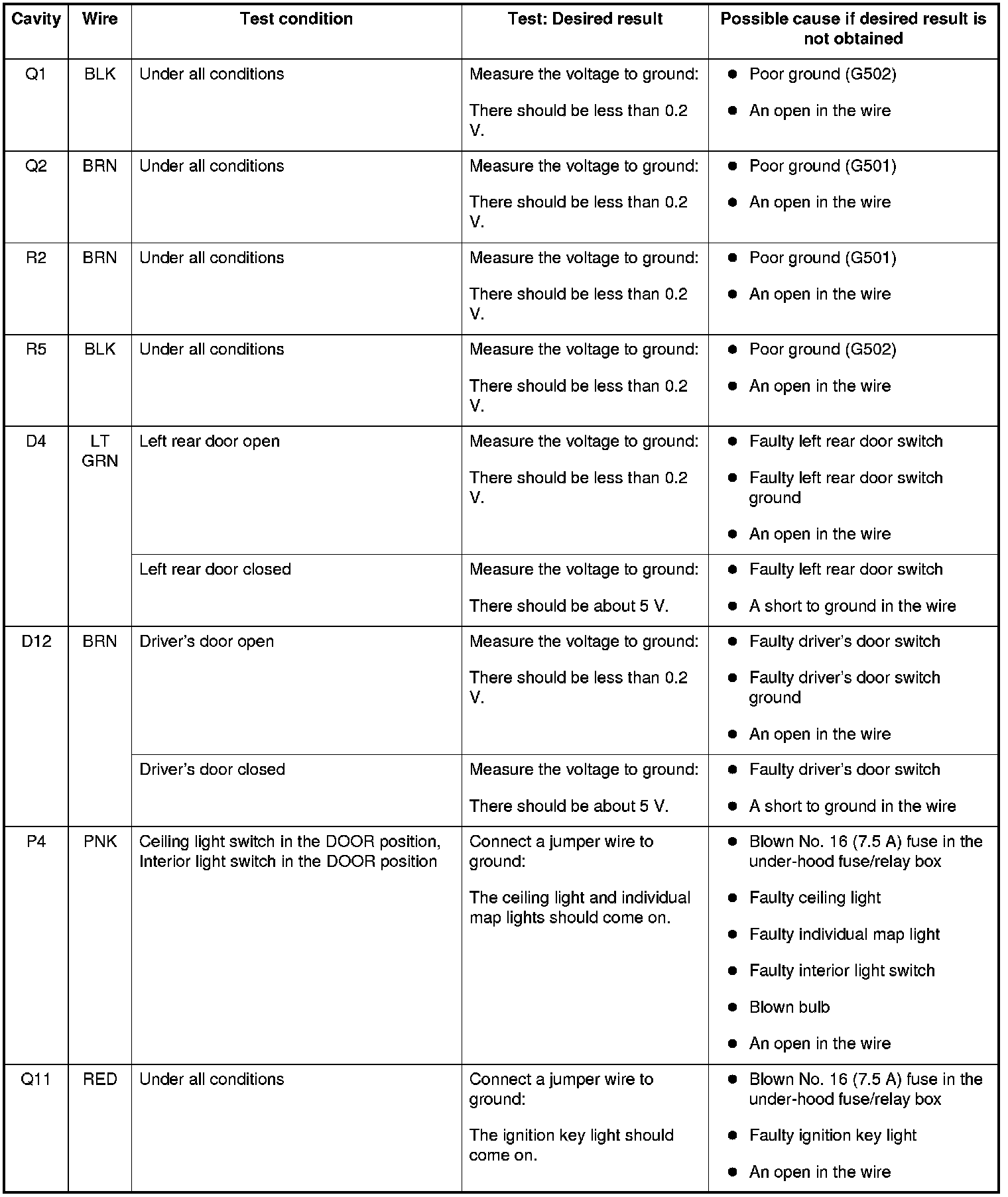 5. Reconnect the connectors to the driver's under-dash fuse/relay box, and do these input tests at the following connectors.