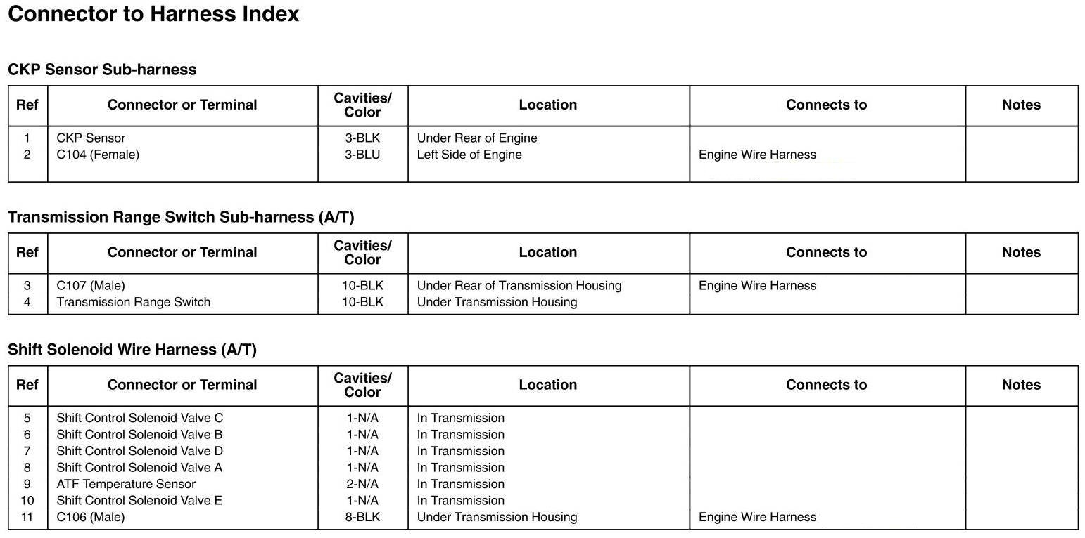 CKP Sensor Sub-harness, Transmission Range Switch Sub-harness, And Shift Solenoid Wire Harness Connector And Harness Locations