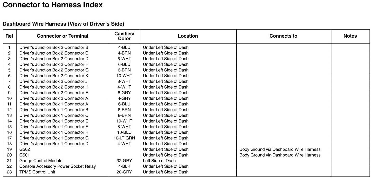 Dashboard Wire Harness (View Of Driver's Side) Connector And Harness Locations