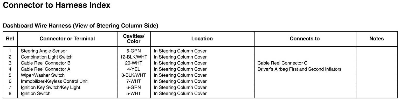 Dashboard Wire Harness (View Of Steering Column Side) Connector And Harness Locations