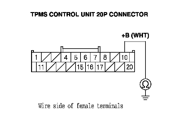 11. Measure the voltage between body ground and TPMS control unit 20P connector terminal No. 10.